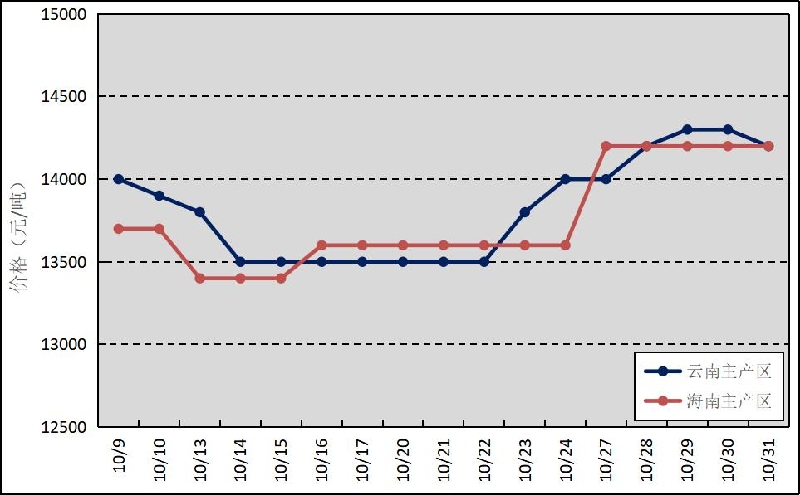 國內(nèi)主產(chǎn)區(qū):云南產(chǎn)區(qū)天氣狀況較好,割膠作業(yè)有序恢復(fù),原料供應(yīng)小幅增量。海南產(chǎn)區(qū)臺風(fēng)、降水天氣擾動偏多,對割膠作業(yè)影響明顯,新膠上量節(jié)奏緩慢,產(chǎn)區(qū)旺產(chǎn)季供應(yīng)不旺特征凸顯。云南、海南鮮膠乳(折干膠)月均價格分別為13824元/噸、13753元/噸,環(huán)比分別下跌717元/噸、783元/噸。
