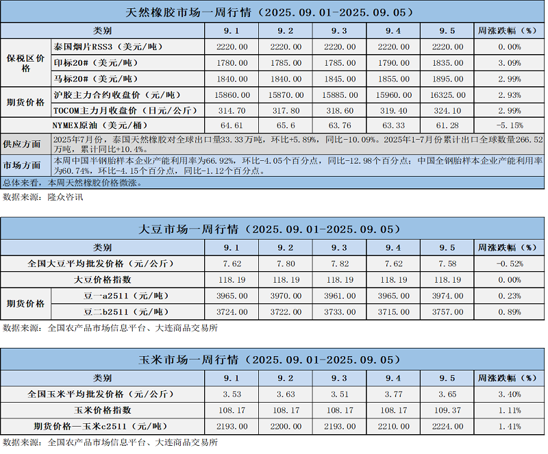 天然橡膠、大豆、玉米市場一周行情(2025.09.01-09.05)