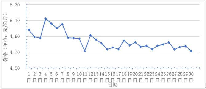 9月,全國重點監測農產品批發市場香蕉總交易量達9.1萬噸,同比上漲8.3%,環比上漲5.8%;總交易價值 41441.1萬元,同比上漲12.5%,環比下降1.1%。日平均價格最高為5.1元/千克,最低為4.7元/千克,全月平均價格為4.8元/千克,同比上漲2.1%,環比下降4%(每日價格變化如圖)。