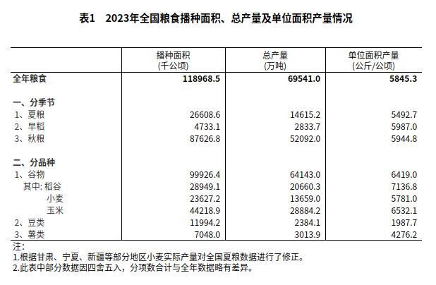根據對全國31個省(區、市)的調查,2023年全國糧食播種面積、單位面積產量和總產量分別如下: