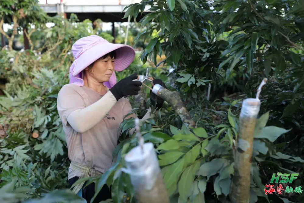 夕陽西下,荔枝園沐浴在金色的余暉中,工人仍在園中忙碌著,一株株新嫁接的荔枝樹在微風中輕輕搖曳,孕育新的希望。